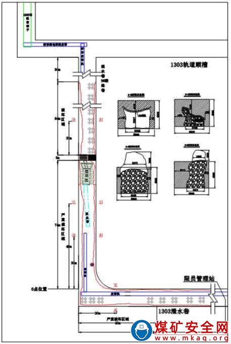 1303 工作面泄水巷與 3 號聯絡巷拐點以外 100 米巷道,拐點向上 74 米巷道,共 174 米巷道出現不同程度破壞,其中嚴重段為拐點以外 40 米巷道及拐點向上 74 米巷道,共計 114 米;3 號聯絡巷貫通點向上 174 米巷道出現不同程度破壞,其中嚴重段為貫通點以上 84 米巷道。破壞巷道共計 348 米,其中嚴重破壞段為198 米。巷道破壞位置見圖 4,具體情況如下: