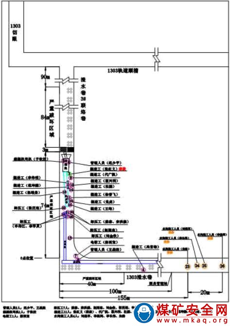 事故當班,綜掘隊和防沖項目部在 1303 工作面泄水巷及 3 號聯絡巷施工。