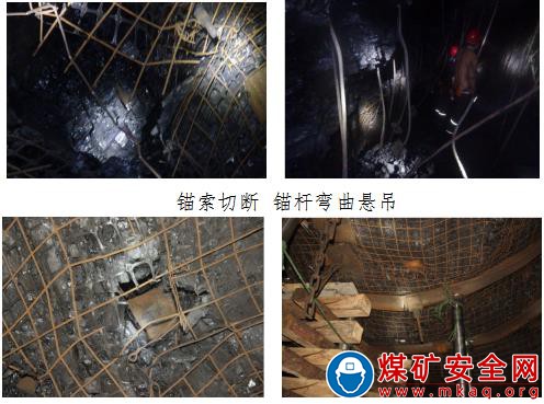 拉伸頸縮,表明巷道破壞瞬間錨桿、錨索承受了水平載荷作用,頂部煤體在水平沖擊載荷作用下發生碎脹變形,可以推斷頂煤冒落的主要原因是在破壞瞬間,巷道頂部煤體在沖擊載荷作用下發生碎脹變形,導致錨桿、錨索無法對其進行有效約束。