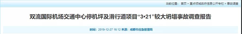 經調查認定,雙流國際機場交通中心停機坪及滑行道項目“3·21”坍塌事故是一起生產安全責任事故,事故等級為較大事故。