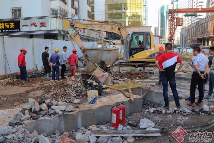 記者在現(xiàn)場(chǎng)看到,中鐵十八局、燃?xì)夤尽⑾绬挝弧⒔痪瘑挝弧④壍拦镜裙ぷ魅藛T正在事發(fā)區(qū)域進(jìn)行搶修,一輛消防車停靠在施工圍擋墻外,一輛標(biāo)有昆明煤氣的搶修車輛及兩輛標(biāo)有云南中石油昆侖燃?xì)獾娜細(xì)鈸岆U(xiǎn)車輛停在施工區(qū)域內(nèi),另有一臺(tái)挖掘機(jī)正在作業(yè),一旁的交通信號(hào)燈已經(jīng)熄滅,交警在交叉口指揮疏導(dǎo)通行車輛。