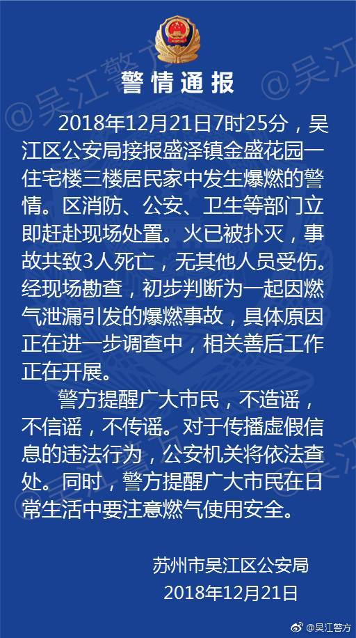 ?。>橥▓螅!娟P于盛澤鎮爆燃事故的警情通報】警方提醒廣大市民,不造謠,不信謠,不傳謠。對于傳播虛假信息的違法行為,公安機關將依法查處。同時,警方提醒廣大市民在日常生活中要注意燃氣使用安全。