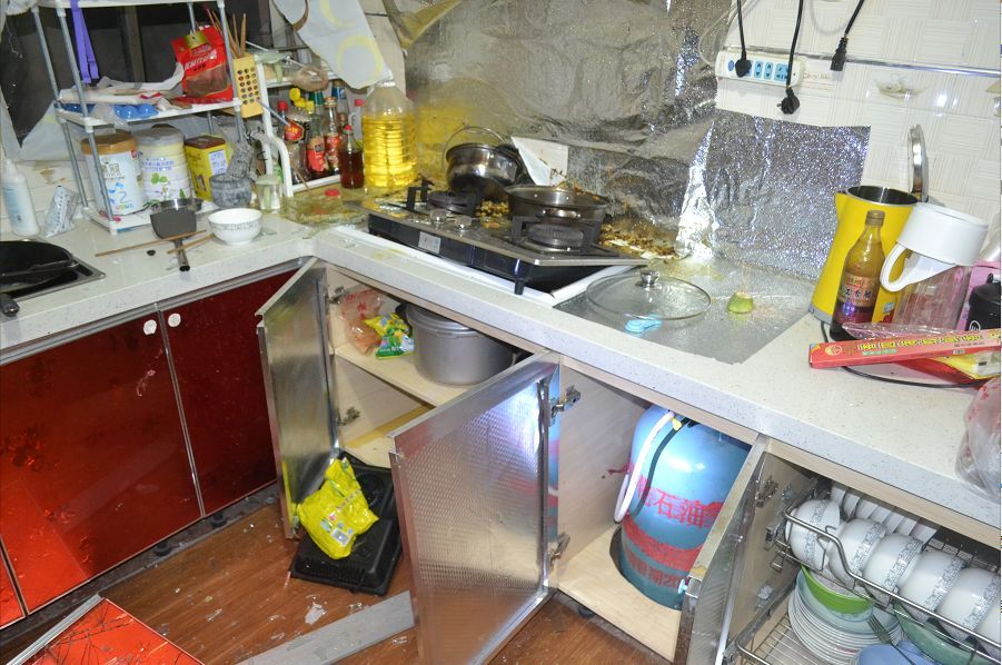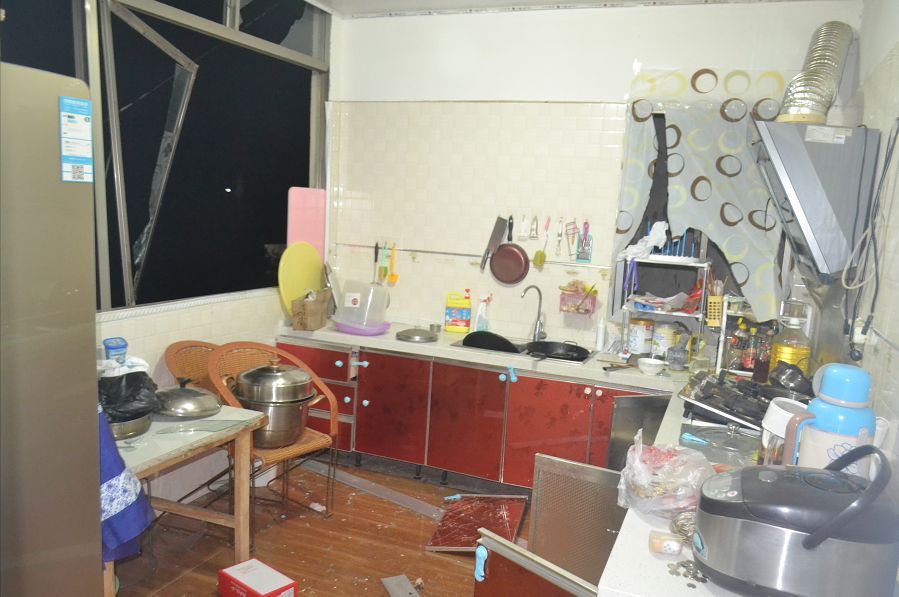 爆炸點位于新村鎮(zhèn)一村民楊某某家中的廚房,現(xiàn)場一片狼籍,窗戶也已經(jīng)飛出窗外。幸運(yùn)的是,爆炸發(fā)生時沒人在現(xiàn)場,未發(fā)生人員傷亡。