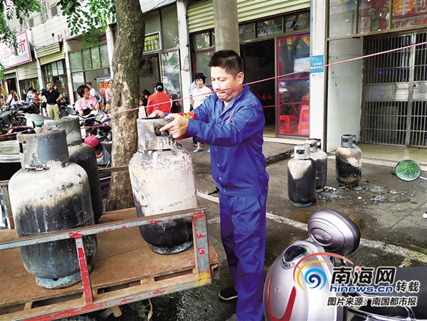 海口一家早餐店煤氣泄漏引發火災 店鋪燒毀6個煤氣瓶燒黑