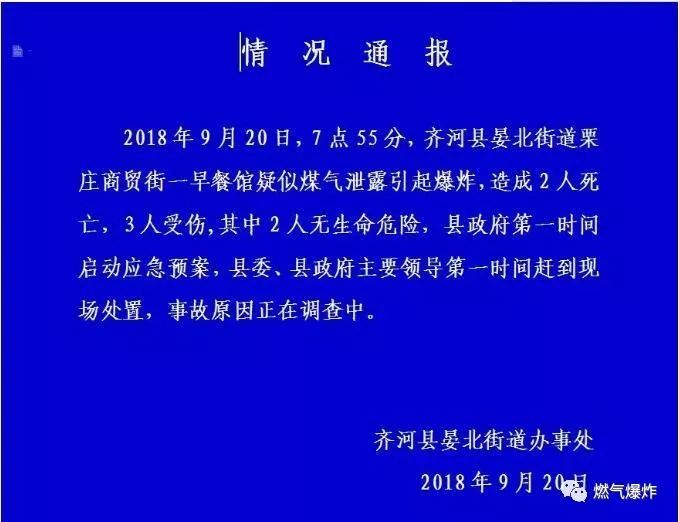 20日上午,10時(shí)左右,齊河縣晏北街道辦事處對(duì)外發(fā)布《情況通報(bào)》稱,2018年9月20日,齊河縣晏北街道栗莊商貿(mào)街一早餐館疑似煤氣泄漏引起爆炸,造成2人死亡,3人受傷,其中2人無生命危險(xiǎn),縣政府第一時(shí)間啟動(dòng)應(yīng)急預(yù)案,縣委、縣政府主要領(lǐng)導(dǎo)第一時(shí)間趕到現(xiàn)場(chǎng)處置,事故原因正在調(diào)查中。