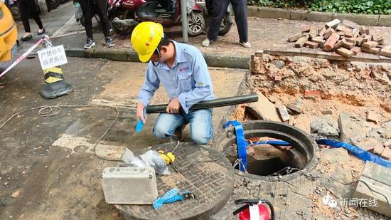 先不要敲,先不要敲,我們查一下濃度先,要不等一下(有)火花(發生)爆炸,這是雨水井啊,測一下濃度。這是雨水井,雨水井如果有氣進去了同樣會爆炸,現在地下也是有,還是有是吧,等一下散了才能敲。