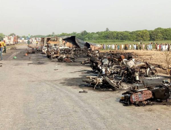 據巴基斯坦黎明報6月25日報道,據巴基斯坦消防局人員消息稱,巴基斯坦東部一油罐車翻車而引發的大火,目前已經至少造成123人遇難。