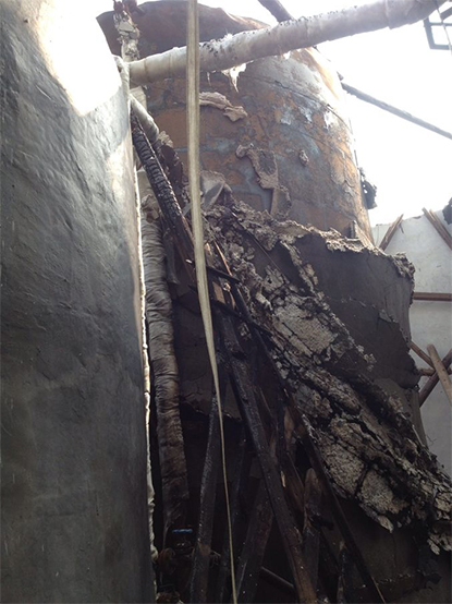 現(xiàn)場(chǎng)勘察發(fā)現(xiàn),3號(hào)罐輸送至1號(hào)罐的輸送管水平距離為10米,并用保溫材料進(jìn)行保溫。爆炸現(xiàn)場(chǎng)1號(hào)罐固定頂被炸飛,另兩只儲(chǔ)罐完好。爆炸的1號(hào)罐罐頂材質(zhì)為厚度5mm的鐵板,自制而成。內(nèi)壁較為粗糙,進(jìn)料口附近約50cm的范圍內(nèi)有熏黑的痕跡,未煙熏部分有鐵銹。罐頂設(shè)有人孔蓋和放空口,在人孔蓋附近無(wú)保溫材料,外壁有明顯燃燒的痕跡,人孔蓋與罐頂原有焊接縫處的焊接片脫落,說(shuō)明罐頂外壁燃燒有一段時(shí)間。被結(jié)晶萘堵塞點(diǎn)位于1號(hào)罐罐頂進(jìn)料口水平距離約40cm,垂直距離約40cm,堵塞點(diǎn)與進(jìn)料口連接的法蘭已拆除;現(xiàn)場(chǎng)留有氣割槍等工具。