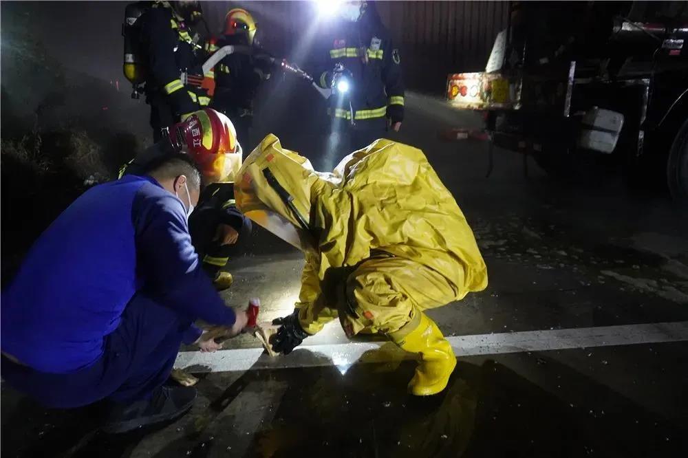 隨后,消防救援人員設置水槍陣地對空氣中的鹽酸進行稀釋處置,并協調相關聯動單位調來石灰和沙土對泄露鹽酸進行堵截。經過5個小時的持續處置,現場環境監測部門監測確認無危害后,消防救援人員移交現場。