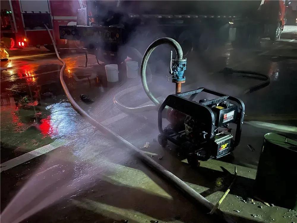 與此同時,戰斗員穿戴好防化服,在水槍的掩護下帶著無火花快速堵漏器材靠近閥門實施堵漏作業。經過47分鐘的努力,22時30分,堵漏成功,隨后前方指揮部安排儲罐車對泄露鹽酸車輛進行倒罐處置。